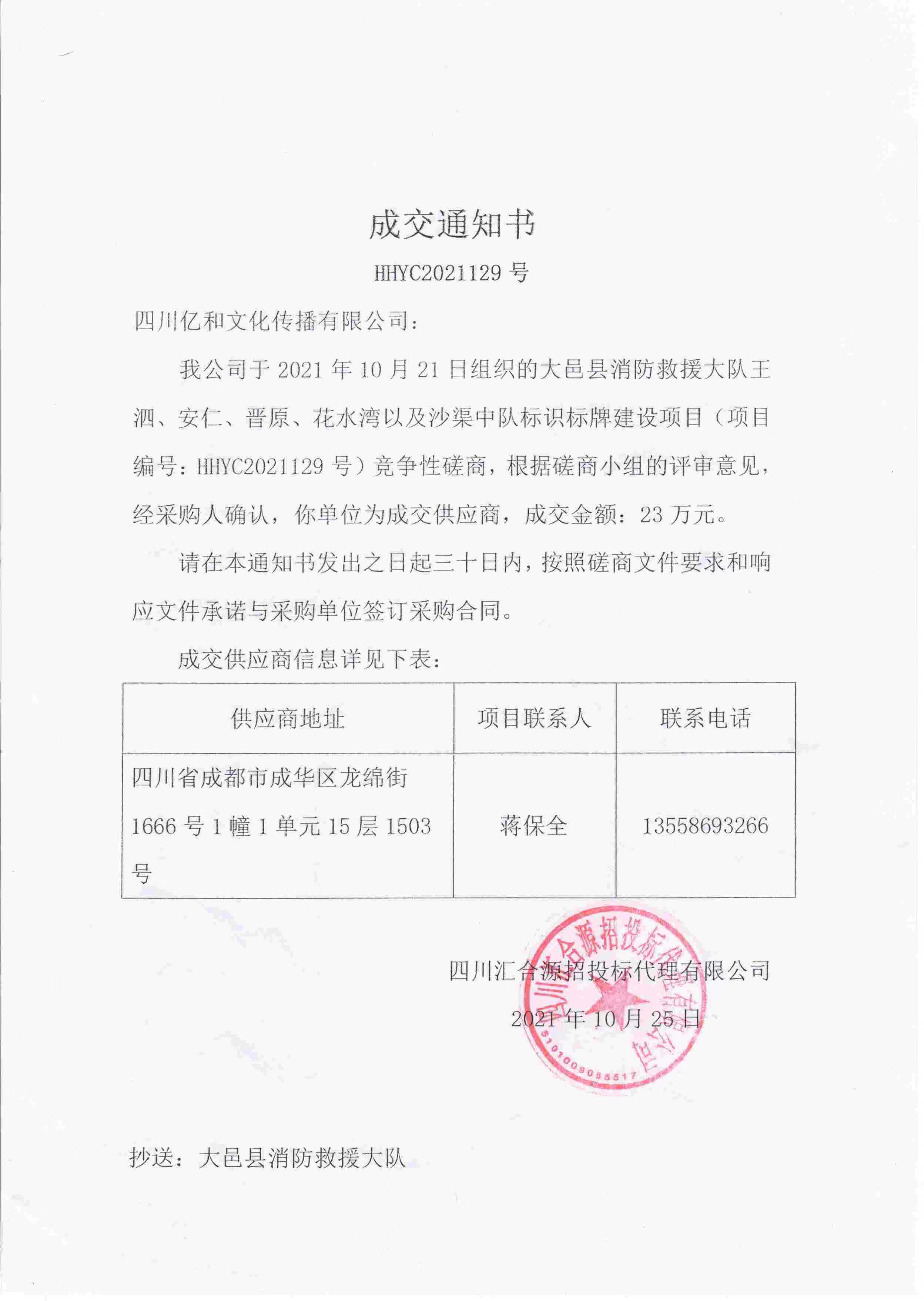 【喜訊】公(gōng)司中(zhōng)标2021年“成都市大邑縣消防救援大隊王泗、安(ān)仁、晉原、花(huā)水灣以及沙渠中(zhōng)隊标識标牌建設項目”!