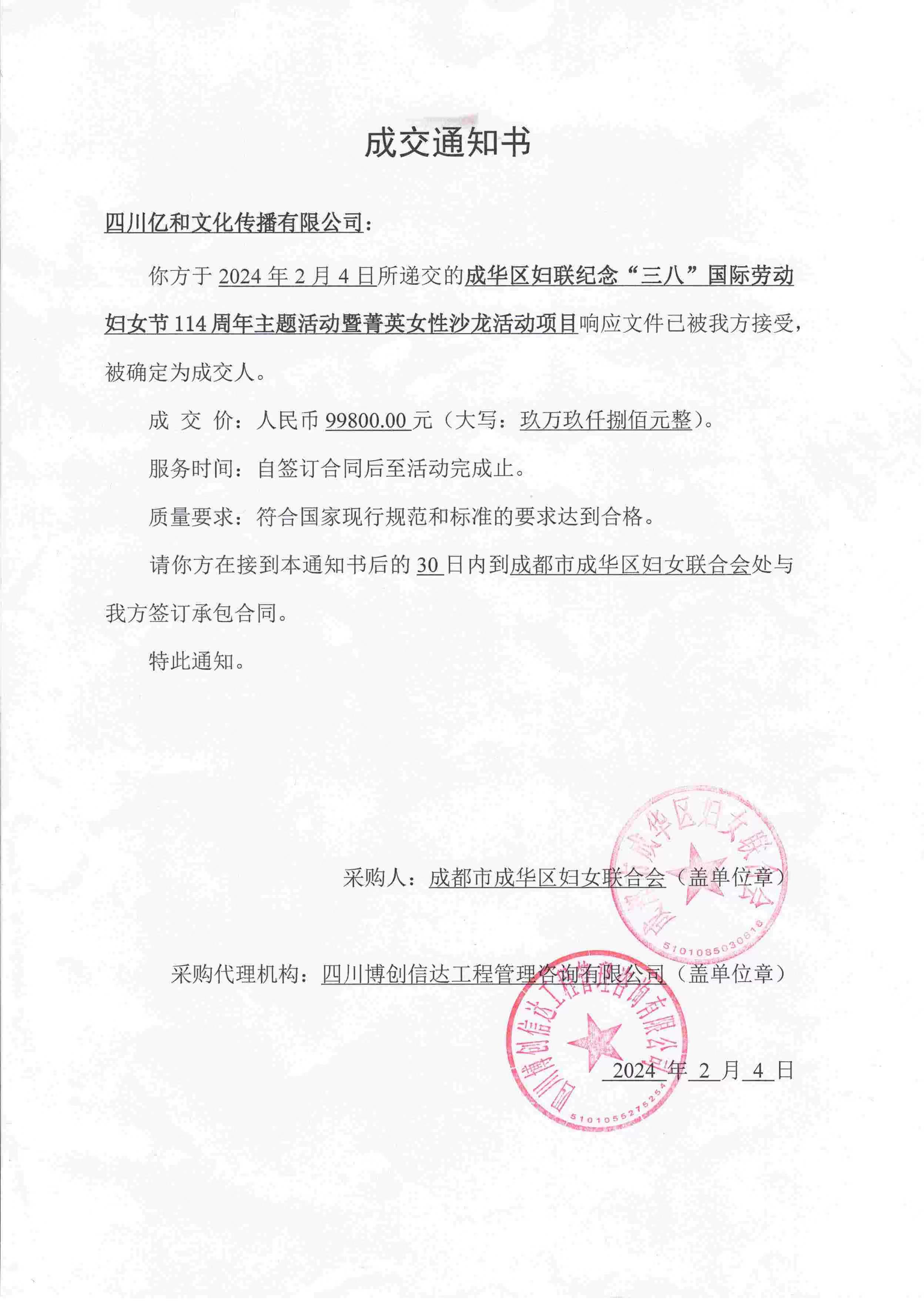 【喜訊】公(gōng)司中(zhōng)标2024年“成華區(qū)婦聯紀念‘三八’國(guó)際勞動婦女節114周年主題活動暨菁英女性沙龍活動項目”!