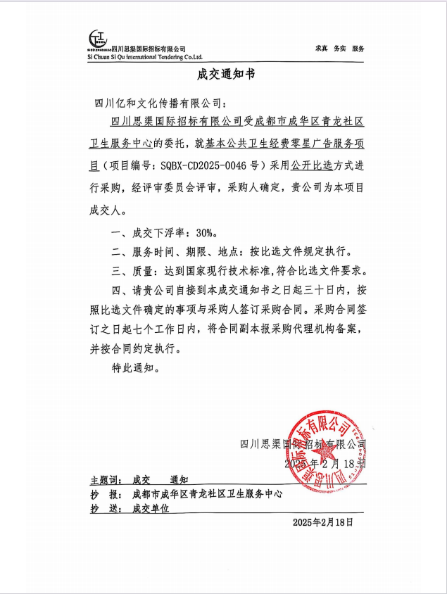 【喜訊】公(gōng)司中(zhōng)标成都市成華區(qū)青龍社區(qū)衛生服務(wù)中(zhōng)心“基本公(gōng)共衛生經費零星廣告服務(wù)項目“
